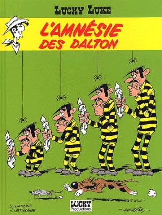 Les Dalton creusent un tunnel pour s'évader mais Averell tient le plan à l'envers de sorte qu'ils se retrouvent dans la cellule de leur voisin Burns. Là ils entendent la discussion du gardien et de l'avocat de Burns. Ce dernier annonce à Burns qu'en raison de son amnésie, due au rocher qu'il avait reçu sur la tête, il est libéré. Les Dalton retournent alors dans leur cellule et Joe explique à ses frères qu'ils doivent faire semblant d'être amnésiques. Ils font alors sauter la prison à la dynamite et les pierres qu'ils reçoivent alors sur la tête leur servent de prétexte pour prétendre qu'ils sont amnésiques et c'est ainsi qu'ils sont libérés sous la bonne garde de L.L. qui est chargé de leur faire retrouver la mémoire. Rantanplan également est devenu amnésique et se prend alors pour un chat. L.L., muni d'un mandat du gouverneur amène alors les Dalton dans une banque espérant qu'ainsi les Dalton retrouveront la mémoire, mais ceux-ci ne bougent pas. Le lendemain L.L. donne son revolver, déchargé à Joe pensant qu'en manipulant cet engin il se souviendra de sa vie antérieur. Seulement Joe avait caché une balle dans ses vêtements et tire sur L.L. c'est à ce moment que Rantanplan qui se prend toujours pour un chat fait tomber Joe qui rate sa cible. L.L. essaie alors par tous les moyen de leur faire revenir la mémoire. Pour Joe il pose son revolver devant lui, pour Averell il remplit les armoires de vivres, il va même jusqu'à attaquer une diligence avec eux, mais rien n?y fait. C'est Jack qui craque le premier car il vole les couvert du restaurant. L.L. le découvre et le ligote. L.L. leur fait alors mettre des troncs d'arbres à travers les rails pour attaquer le train. Les frères Dalton doivent détrousser les passagers pour ensuite leur rendre l butin. Quand ils ont rendu les objets il manque le portefeuille du gouverneur, c'est William qui l'avait gardé. Le deuxième frère est donc démasqué et L.L. le ligote également. L.L. leur fait alors la surprise d'aller rendre visite à leur mère qui est heureuse de retrouver son chérie Averell. Les Dalton expliquent le problème à leur mère et elle conseille à L.L. d'aller attaquer la banque de keepsake City car c'est là que leur père leur avait appris les rudiments du métier. L.L., comme d'habitude tend au banquier la lettre du gouverneur expliquant le pourquoi de sa démarche, seulement Mme Dalton a remplacé la lettre du gouverneur par une autre disant qu'il était un bandit et qu'il allait tuer les otages. Le banquier appelle alors le shérif qui met L.L. en prison et libère les Dalton. Les Dalton, invité à la réception du maire oblige celui-ci à démissionner pour complicité avec le bandit L.L. et le maire se trouve en prison avec L.L. Le shérif avertit Washington de l'arrestation de L.L. Les Dalton organisent alors le procès de L.L. pour le condamner à mort. C'est Averell qui sera l'avocat de L.L. et le jury se compose de gens pas très recommandables. Joe, président du tribunal condamne L.L. à mort mais c'est Averell à qui L.L. a eu le temps d'expliquer sa plaidoirie, et qui, tout fier de son rôle, gaffe en déclarant que c'est les frères Dalton les responsables de cette machination. Joe risque de faire une crise et se jette sur Averell. L.L. en profite pour désarmer les frères Dalton et de dissiper les doutes. Les Dalton se retrouvent en prison en train de casser les cailloux et dans sa colère Joe fait tomber une pierre sur la tête de Rantanplan qui retrouve la mémoire. Catégorie(s) > BD > Aventures et Humour > LUCKY LUKE
